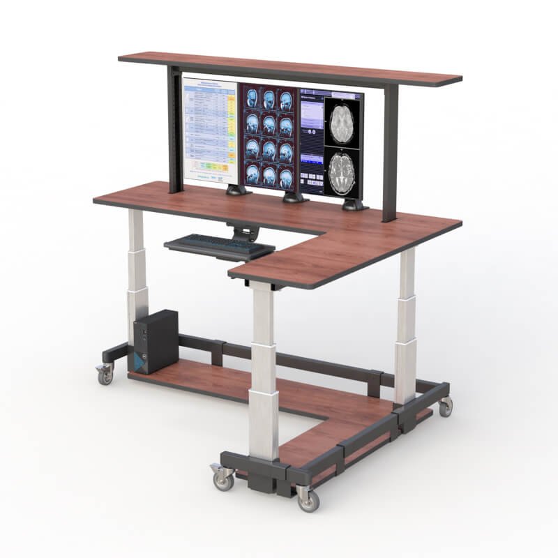 An ergonomic L-shaped Standing Movable Desk with two display monitor arms, keyboard tray, overhead shelf, bottom tray, and caster wheels. This corner workstation is designed to make efficient use of floor spaces. Loaded with multiple capabilities that are all built into one heavy-duty piece of furniture that can fit into any corner.