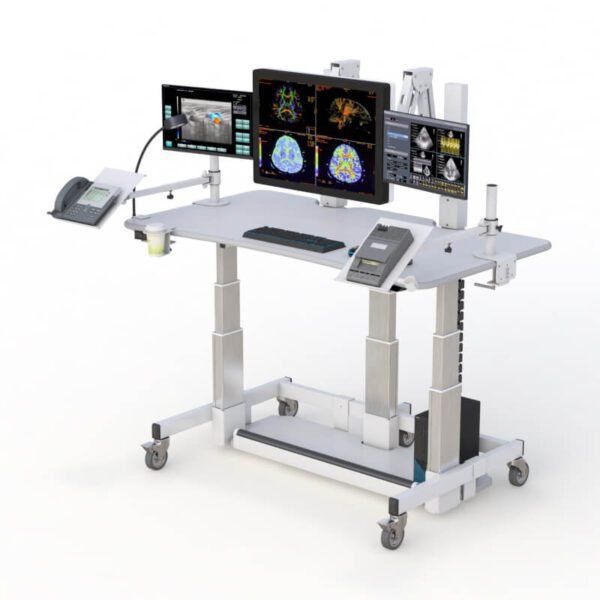 Radiology reading room furniture with multi-monitor arms. This computer desk has independent electronic height adjustable desktop and monitor platform, wire management, adjustable phone arm, and footrest .