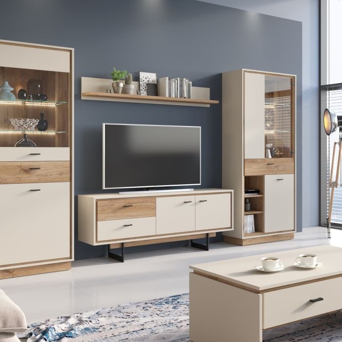 How do you imagine evening or afternoon relaxation with your loved ones? In addition to board games, you certainly love the time spent on a comfortable sofa in the company of a select cast of family cinema actors. In addition to the sofa, you will need a TV cabinet from the Rivero series, which will provide you with comfort of use, spacious storage space and will enhance the visual effect of a stylishly decorated living room. The Rivero TV unit has two spacious drawers and a two-door front that protects against sight shelves, which, together with the furniture carcass, are made of laminated chipboard. It includes guides and soft-close hinges. The stylish TV unit is kept in a modern, simple style, which is emphasized by a metal frame and metal, minimalistic handles. The whole is finished in subdued, fashionable colours of wood (Dark Flagstaff Oak and Silicon Gray). The high-quality TV unt is made with precision, visible in long-term, reliable use. Its excellent visual effect allows you to create a unique interior design in a modern, industrial and vintage style. Choose a cabinet that will provide excellent support for audio and video equipment and will perfectly match the standing and hanging elements of the Rivero series. The lowboard can be used in a spacious interior.